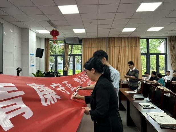 党课结束后,全体党员在余杰老师的领誓下,举起右拳面对党旗庄严宣誓,共同重温入党誓词,用铿锵有力的声音许下共产党人的十二句承诺,激励每个毕业生党员以党员的先进性、纯洁性要求自己,时刻保持进取精神,不忘初心,牢记使命。此外,全体与会党员师生在廉洁从业主题横幅上郑重签字,承诺清廉守正,担当实干。大家表明要将廉洁作为自己人生的必修课,不断向一名优秀党员迈进。
