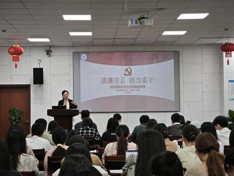 在海洋东楼107会议室召开毕业生党员大会暨廉洁教育活动,为即将踏上新征程的毕业生党员开展最后一堂思政课。学院党委副书记、纪委书记张乐,分团委书记崔浩亮,辅导员吴丹丹、余杰、曹家旗,各学生党支部书记以及2024届全体毕业生党员参加了本次大会,会议由余杰老师主持。