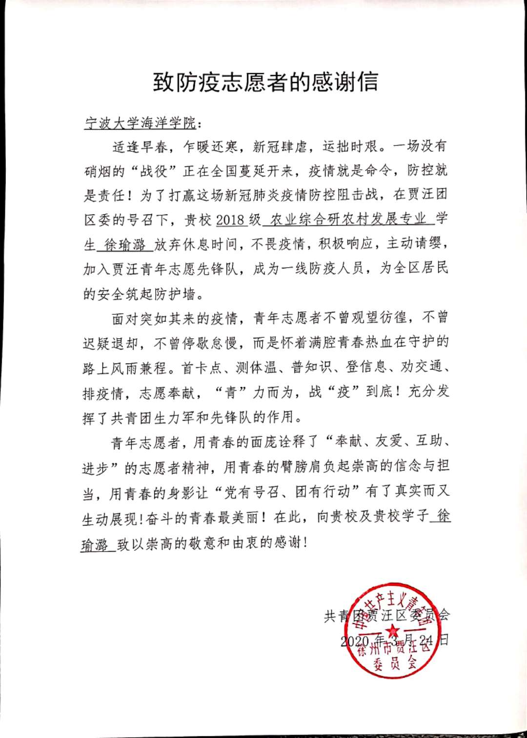 收到共青团徐州市贾汪区委员会寄来的《致防疫志愿者的感谢信》、《荣誉证书》以及表彰文件,感谢和表彰禁漫天堂