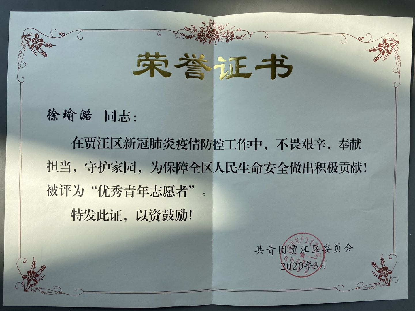 2020年伊始,一场突如其来的新型冠状病毒肺炎疫情打乱了人们的生活,当徐瑜潞看到家乡区团委发布的疫情志愿者征集令后,选择第一时间主动报名,成为老矿街道的一名“列兵”。她说:“当初选择农村发展专业的初衷就是希望有朝一日能够学以致用,为振兴乡村贡献绵薄之力。而今疫情严重,我不是医务工作者,不能奋战在防疫一线,但能加入到贾汪志愿者的队伍中来,为人民服务,为家乡的防疫战做点什么,是我的责任和荣幸。”
