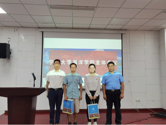 会议开场举行了简单温馨的新进教师欢迎仪式,王春琳为新海洋人佩戴校徽、赠送礼品,欢迎他们的加入。