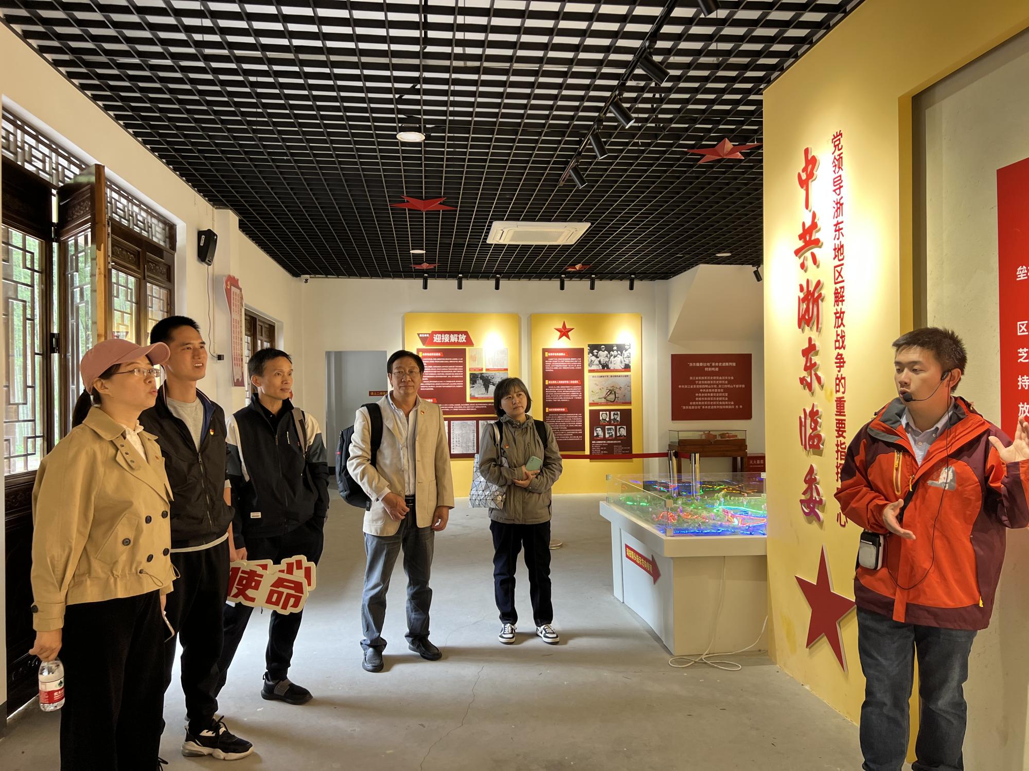 活动当天,党员同志们怀着庄重的心情,前往余姚四明山北麓,走进大隐镇芝林村。首先参观的是渚石坑“公馆”复原址,这些用毛竹和茅草搭建的草舍,见证了在国民党反动派“清剿”四明山时期,革命同志植根群众、军民鱼水的团结精神;也展示了在艰苦抗战下革命同志英勇无畏的乐观精神。随后,在讲解员的带领下,党员同志们一起参观了“浙东临委驻地”革命史迹陈列馆,浙东区党委党干部和新四军浙东游击纵队的撤离后,留守干部坚持保持战略支点,隐蔽斗争。中共浙东临时工作委员会(简称“浙东临委”)的成立,为党和革命群众隐蔽坚持、武装斗争、迎接解放提供了指挥中心,标志着浙东党组织从分散指导发展到集中统一领导的阶段,有力地推动了浙东解放事业发展。党员同志们重温这段峥嵘岁月,更加珍惜来之不易的幸福生活,在工作中将会大力弘扬浙东游击根据地“公馆”精神,以实际行动迎接党的二十大胜利召开。