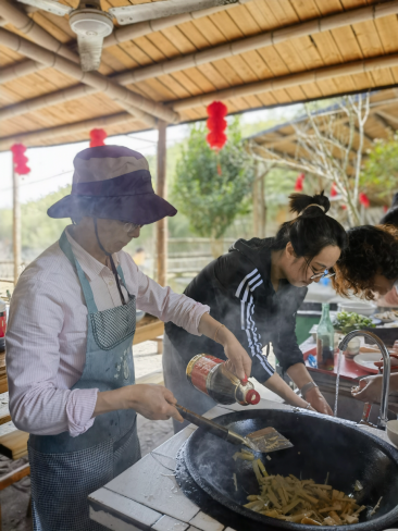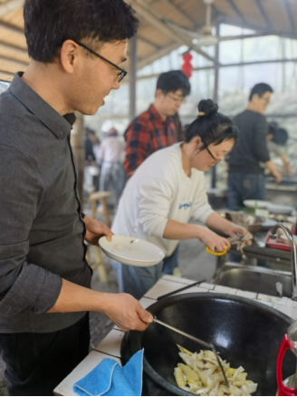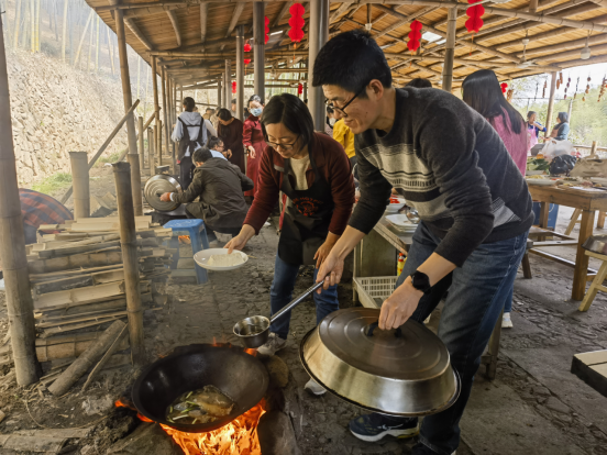 中午时分,大家开始自食其力,纷纷围着柴火土灶穿梭忙碌着,洗切掌勺、不亦乐乎,各展身手、各尽其能,老中青结合,厨艺娴熟的老一辈、初出茅庐的新生代,一个个都极为胜任帮厨、伙夫、主厨的角色,虽为临时凑搭,却忙而不乱,一盘盘色香味诱人的农家土菜出炉,勾起了大家满满的儿时回忆。