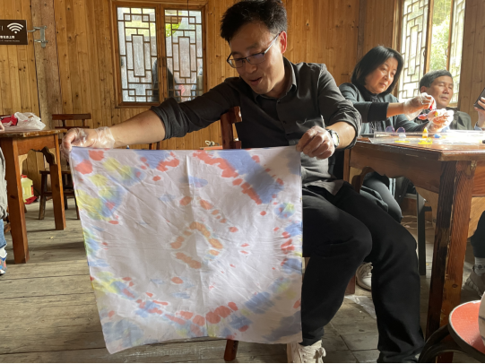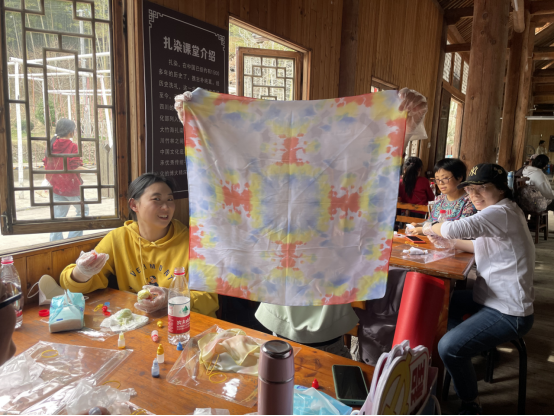 午后时光,大家围坐下来开始了丝巾扎染活动。在老师的指导下,认识了解扎染,扎花,染色。随意一扎、一染,呈现了每一条丝巾独一无二的个性和气质。