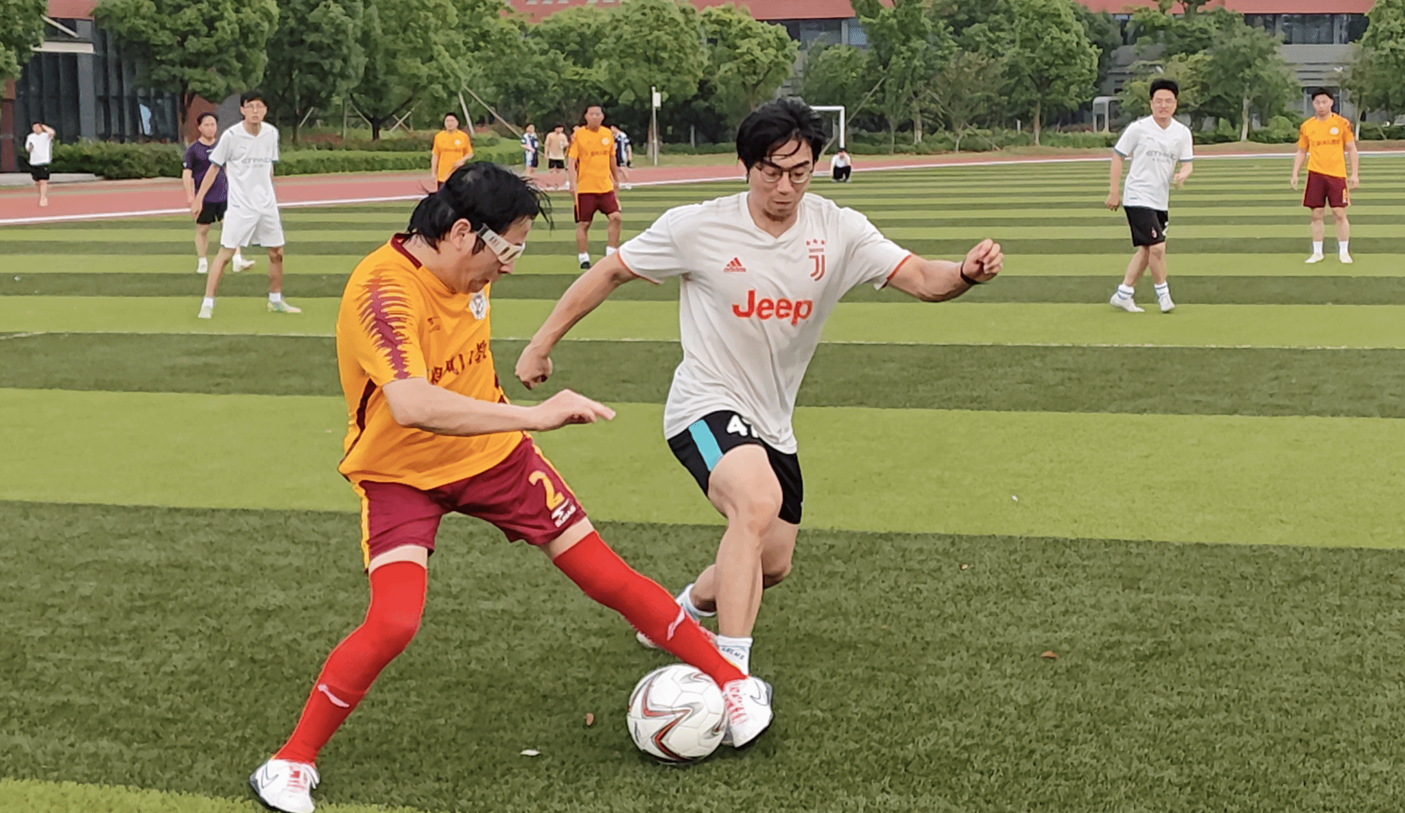 教职工足球友谊赛在梅山校区足球场进行,来自本部校区多个学院和部门的教工,梅山校区的师生,总共28名师生参加了比赛。