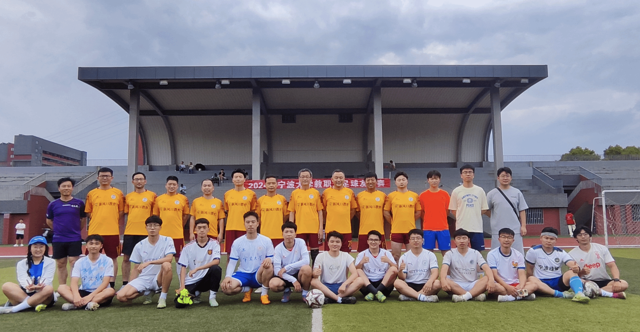 周日的午后,恰逢雷雨降临,双方在拍照合影、握手致敬后开球,足球场上双方排兵布阵,汗水与雨水交织,大家表现出高昂的斗志和顽强的拼搏精神,虽然下着暴雨,但精彩进球依然不停,最终以4:3完成比赛,宁大教工足球队以1球小胜。比赛分为3个小场,每场30分钟,吹哨结束时师生队友依然意犹未尽。通过本次比赛加强了不同校区间的教职工文体交流,增进了师生间的互动和友谊,丰富了梅山校园体育活动,大家相约下一场球赛的举行。