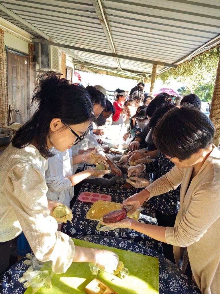 接着,大家跟着农庄的主人加入到打麻糍活动中,边听讲解边自己动手捶打、碾行,切块,包制,成型,吃着说着,一派浓浓的生活气息。