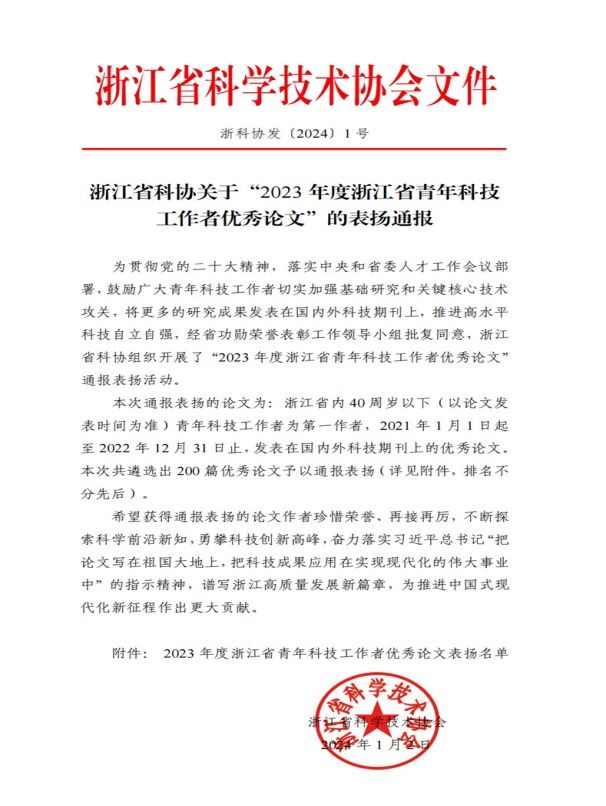 近日,浙江省科协宣布了“2023年度浙江省青年科技工作者优秀论文”的遴选结果,并对获奖者发出表扬通报。此次评选共有200篇论文(含CNS正刊44篇)脱颖而出,其中禁漫天堂