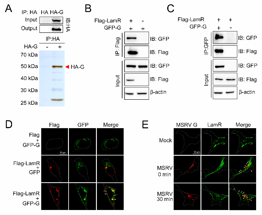 MSRV作为弹状病毒家族的一员,主要感染幼苗及养殖早期的大口黑鲈,对大口黑鲈产业造成严重危害。因此,研究MSRV的致病机理对有效控制病毒的传播和减少养殖业损失具有理论和现实意义。该研究用Co-IP结合LC-MS/MS筛选出多个与MSRV囊膜蛋白(MSRV-G)结合的宿主蛋白。进一步发现LamR与MSRV-G在细胞膜上结合,参与病毒吸附和内化,LamR通过网格蛋白介导的内吞途径介导MSRV进入宿主细胞。在鱼体水平,LamR重组蛋白处理可降低MSRV感染大口黑鲈的死亡率。这些数据证明LamR作为MSRV的受体介导病毒入侵宿主细胞。