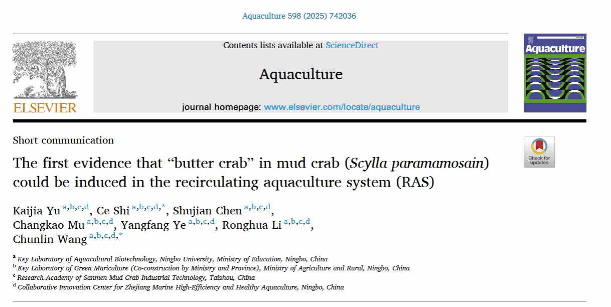 史策、王春琳教授团队首次利用工厂化循环水养殖系统成功诱导“黄油蟹”,转化比例高达40%。该成果以“The first evidence that “butter crab” in mud crab (Scylla paramamosain) could be induced in the recirculating aquaculture system (RAS)”为题,发表在水产领域中国科学院双一区《Aquaculture》期刊上(图1)。