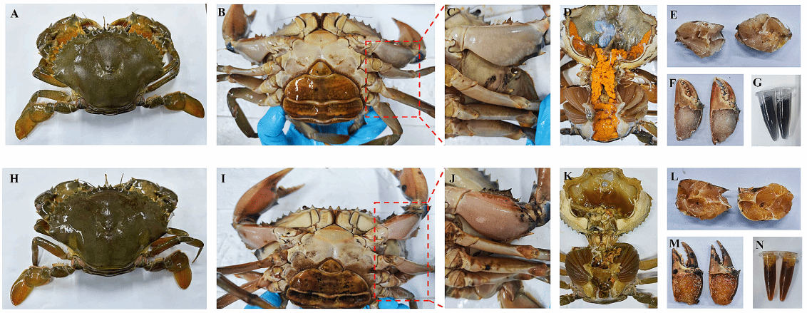 图2 普通青蟹与团队诱导的黄油蟹外观及内部组织对比