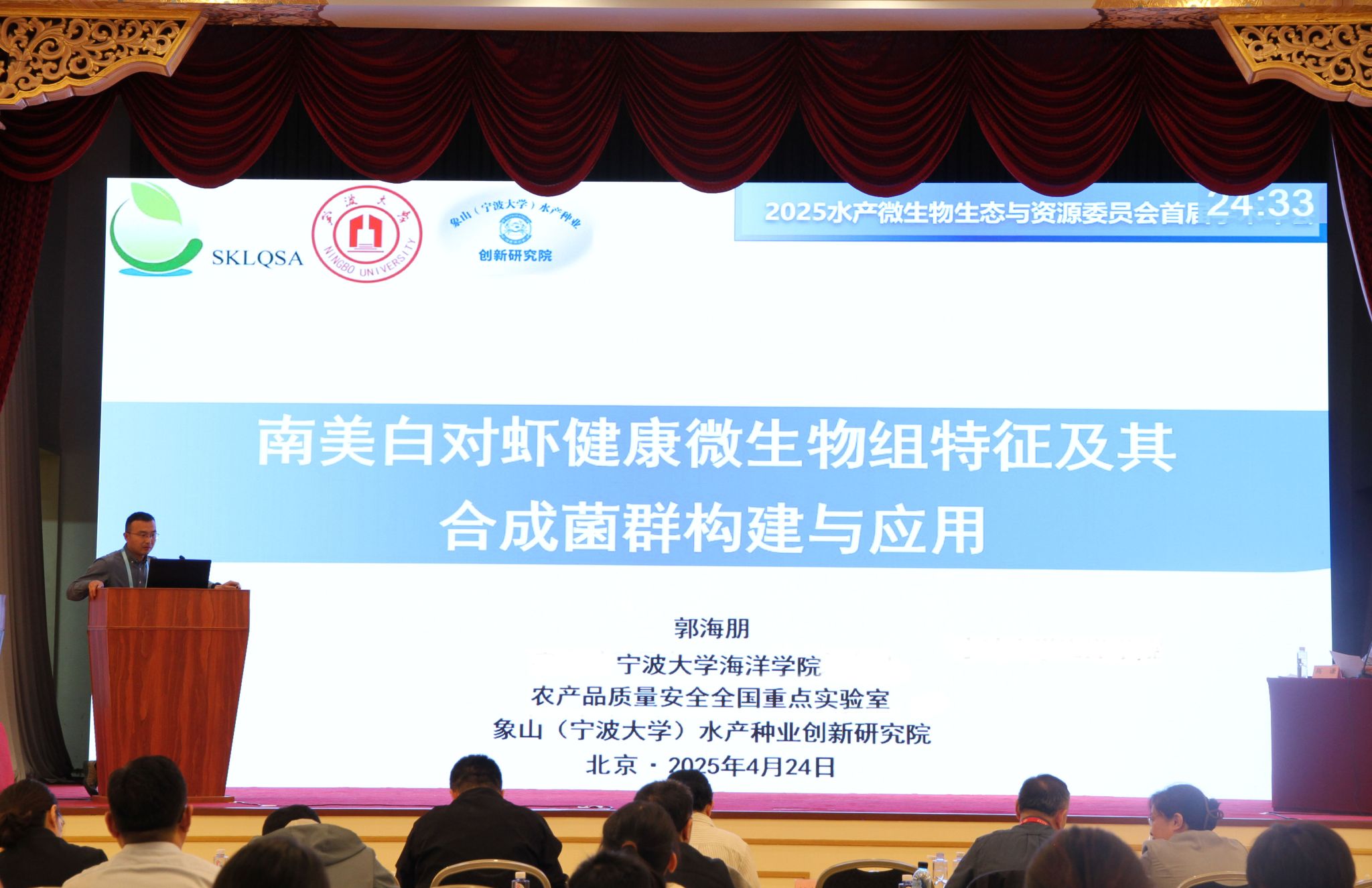 郭海朋副教授在《南美白对虾健康微生物组特征及其合成菌群构建与应用》报告中,系统阐述了对虾肠道核心菌群的功能图谱,构建了首个对虾抗病合成菌群。通过详实的实验数据,系统阐释了合成菌群在促进对虾生长、提升抗病能力和优化养殖环境等方面的作用,为水产健康养殖提供了创新解决方案。
