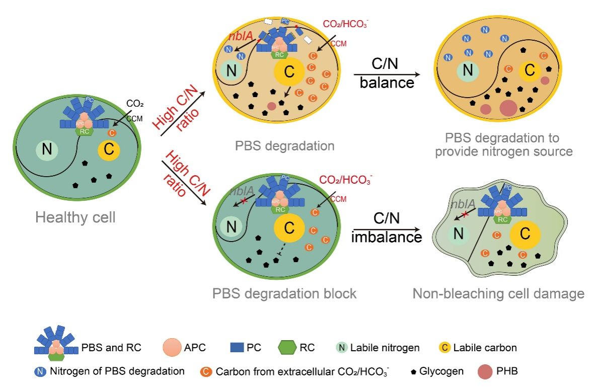 藻胆体(PBS)是蓝藻等光合生物中的主要光收集装置,其降解能为细胞提供大量氮源,供给细胞生长与代谢。在受到氮限制时,蓝藻会降解藻胆体,导致细胞失绿黄化,但氮限制是不是诱导蓝藻降解藻胆体的充分条件尚不清楚,碳/氮平衡与蓝藻藻胆体降解之间的互作与反馈调控机制仍未被揭示。