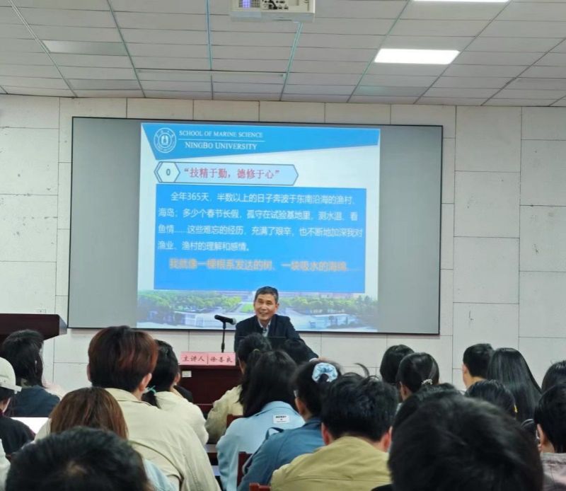 会上,徐善良教授以“我与祖国水产共成长”为主题,分享个人成长和奋斗的故事,讲述一代水产人为祖国水产行业蓬勃发展所做出的努力,从做事和做人两方面说起,激励同学们牢记“技精于勤、德修于心”的人生信条。徐老师通过他与水产行业的七个故事为同学们展现了自己的成长线以及中国水产行业的发展历程。他从“睡稻草铺、点煤油灯玩转贡品香鱼”讲到“只为那只虾,我们掌握了国家机密”,为同学们展现了团队的力量;又从“‘大哥大’与河蟹苗”讲到“比黄金还贵的‘蚶沙’”,启发同学们善于思考、勇于创新、多做实事;还从“另辟蹊径破解厚壳贻贝育苗”讲到“无怨无悔做银鲳奶爸”,激励同学们坚定崇高的理想信念。